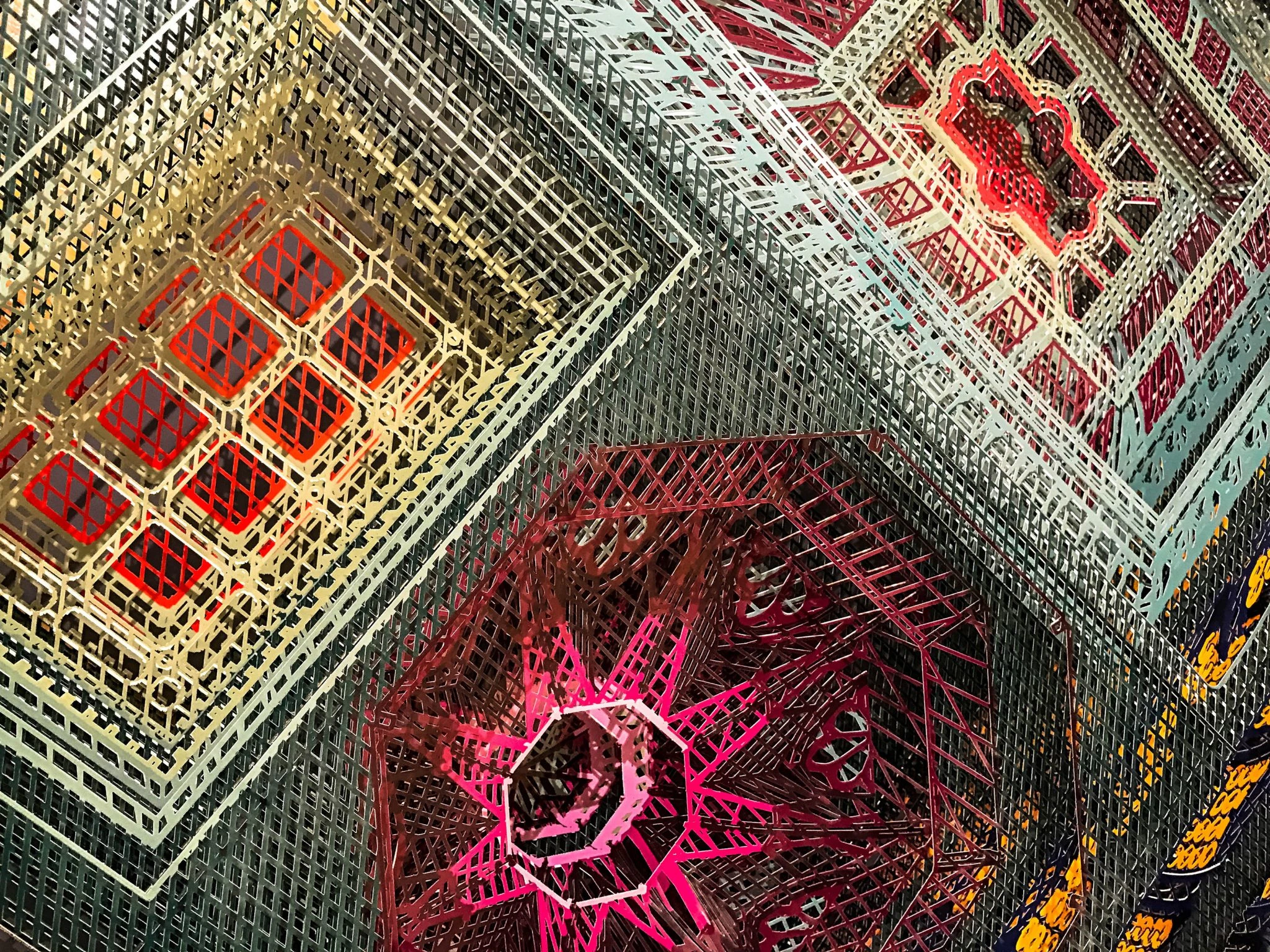 Our FIU Canopy proposal, sited on the roof of the architecture school at Florida International University, reflects the banal roofscape of the building in a series of concentrically aligned layers. The hanging surfaces are populated by linework – hatched textures that unify the disparate geometry of four composed facades, articulating surrounding apertures as luminous interior volumes.