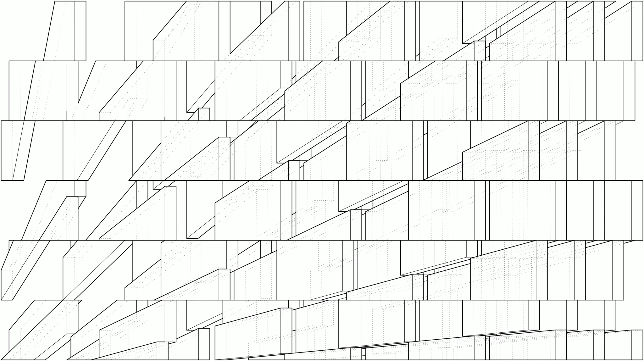 The plaid is the formal and spatial context that ties each individual element, room, or building to its neighbors. In experiential terms, it produces anticipation, displacing attention from the space the occupant is currently in to the next. It creates larger spaces with uncertain extents, porous boundaries that lead you around the corner or reveal a peak into the stack.