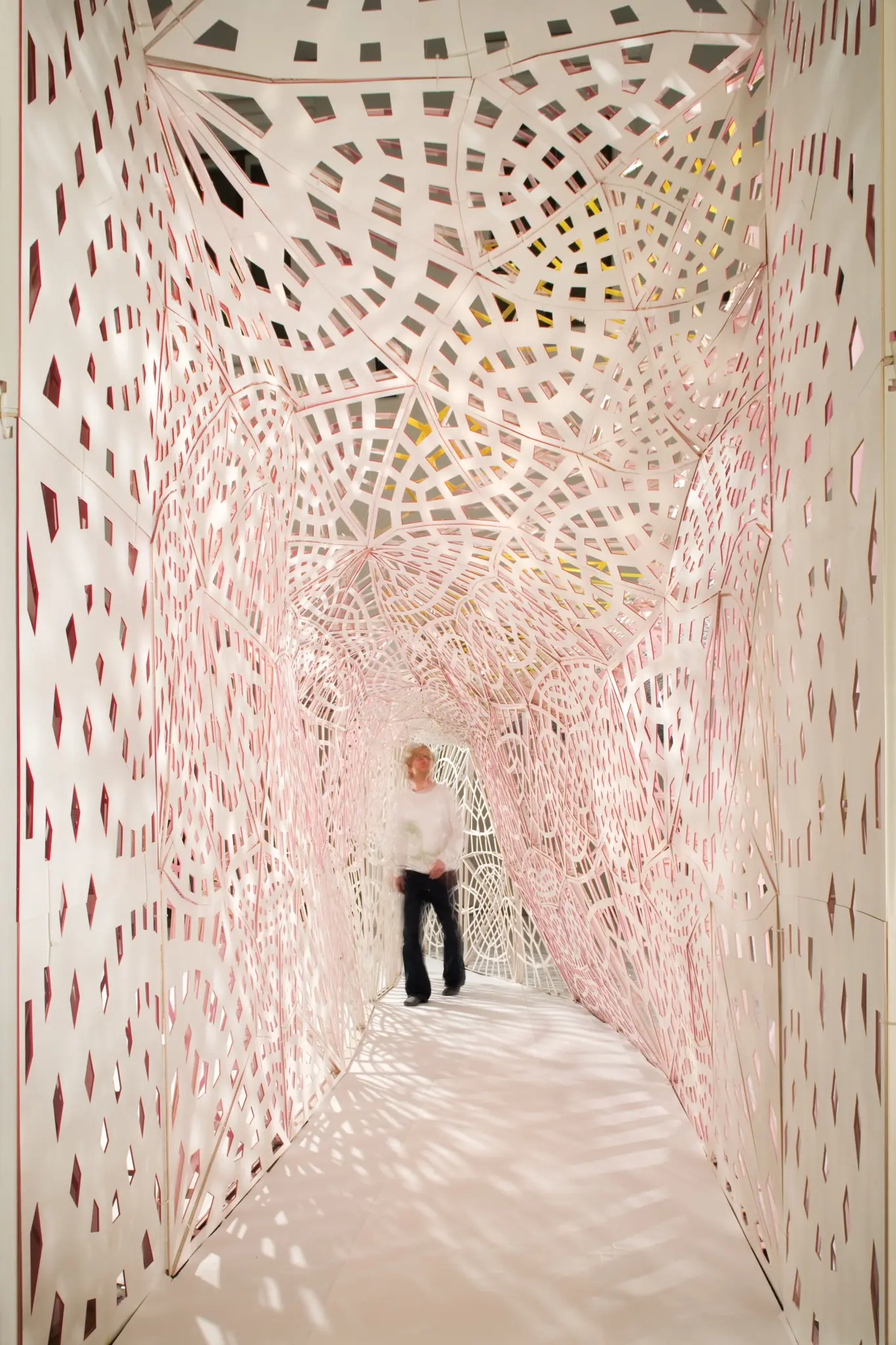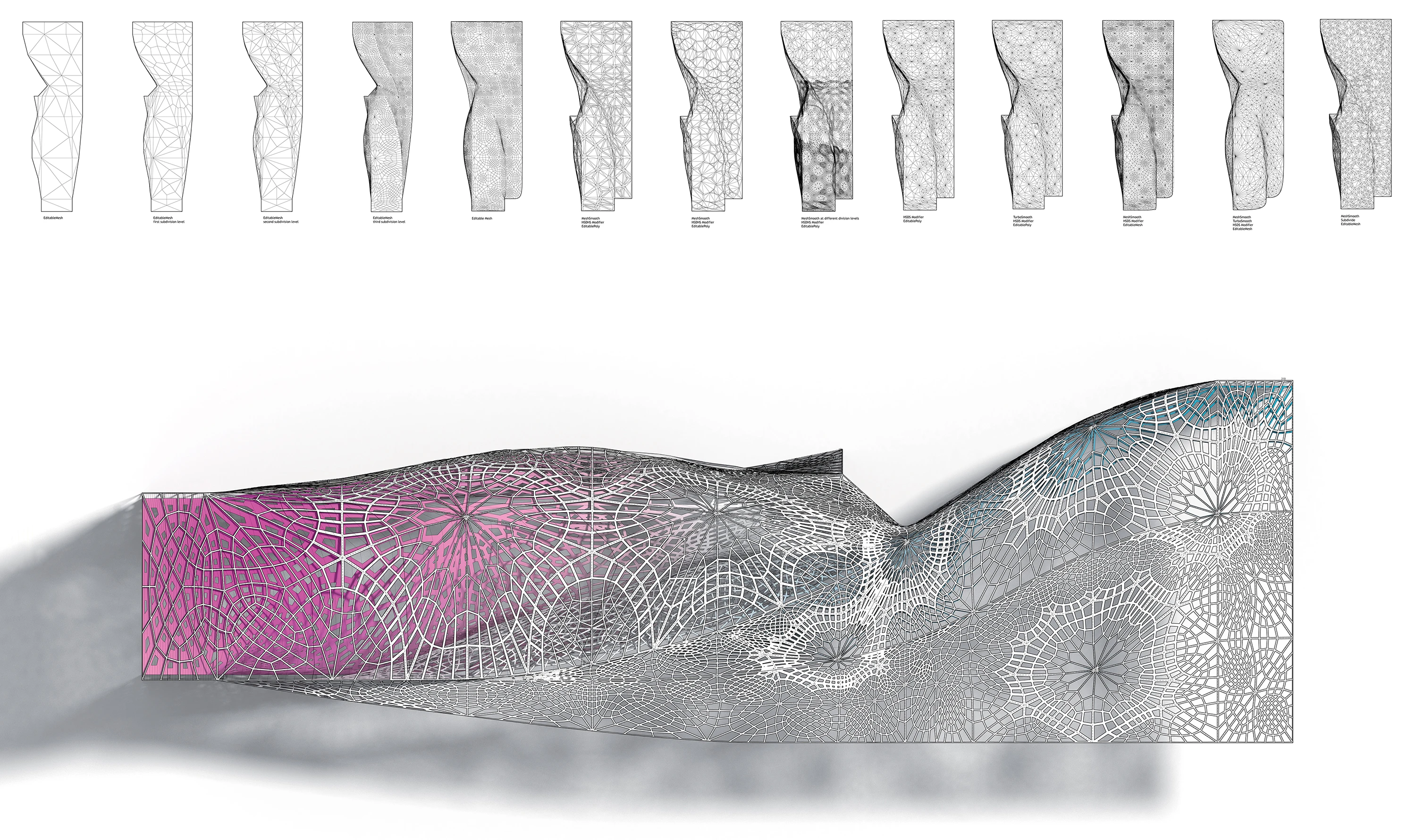 If an iconic building maintains a banal one-liner relationship between figure and form, Technicolor Bloom tests figure at its most undefined and indeterminate: patterns reinforce a certain geometry one moment and cloud it the next; figures emerge separately and simultaneously fuse together. The installation proposes a variation of architectural figure that never produces specific meanings, but evokes only loose, variable associations, remaining in the realm of affect.