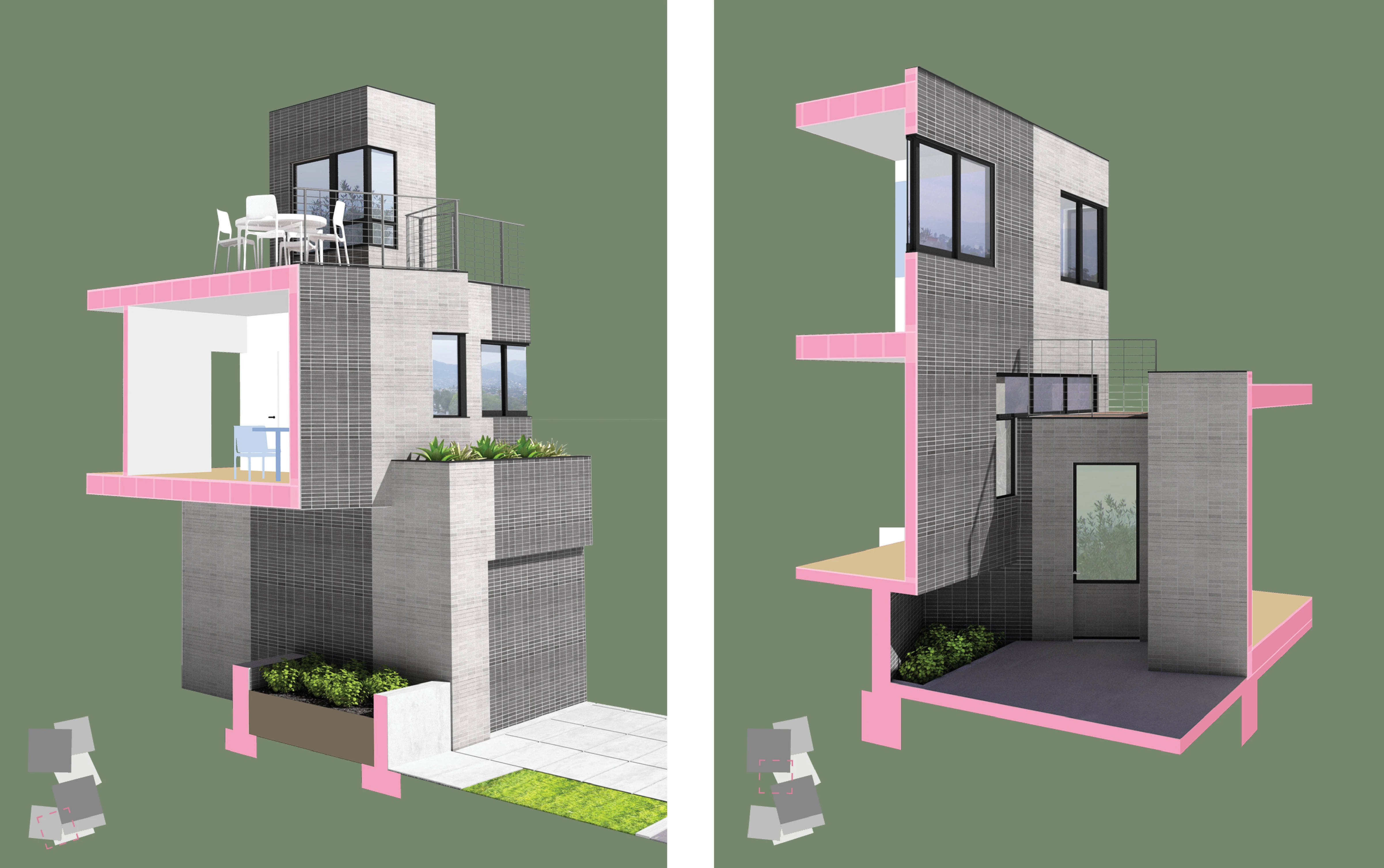 The entrance is located 2 levels above the street at the middle of the sequence, allowing the private spaces to occupy both ends. By placing the kitchen, the house’s only fixed program, at the entry, the design allows all the other rooms to be used in a variety of ways and makes the house equally suitable for multiple families, or roommates, as for one